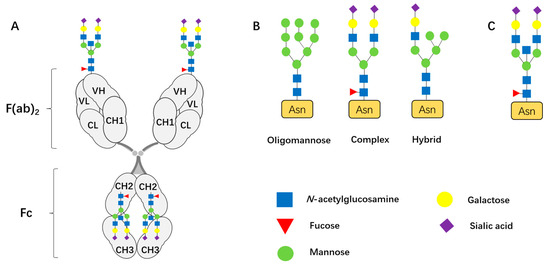 Diagram of N-Linked Glycans on IgG. (A) Fab N-glycosylation is typically located in the variable region, while Fc N-glycosylation is in the CH2 domain. (B) Three major glycan types: Oligomannose-type, Complex-type and Hybrid-type. (C) A bisecting GlcNAc is added to the core of hybrid or complex-type glycans, forms a new subtype of glycan termed bisecting GlcNAc.
