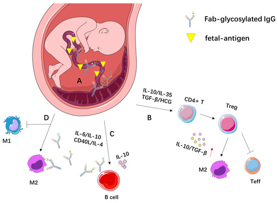 Potential Mechanisms of Fab-Glycosylated IgG in Pregnancy. (A) Fab-glycosylated IgG does not bind to fetal-derived antigens, thereby avoiding the initiation of downstream immune responses and reducing maternal rejection of the fetus. (B) Trophoblast cells secrete cytokines that promote the differentiation of T cells into regulatory T cells (Tregs). (C) Stimulation of term maternal-fetal interface B cells with a combination of CD40L, IL-6, IL-10, and IL-4 promotes increased production of Fab-glycosylated IgG. (D) Trophoblast cells secrete various cytokines that promote macrophage polarization toward the M2 phenotype. Additionally, the mannose residues on Fab-glycosylated IgG can bind to mannose receptors on macrophages, thereby modulating downstream immune responses.