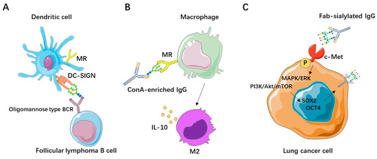 Effect of Fab glycosylation in tumors. (A) Follicular lymphomas may interact with MR, DC-SIGN, via high-mannose glycans, presumably enhancing tumor survival. (B) ConA-enriched IgG binds to the mannose receptor (MR) on macrophages, promoting macrophage M2 polarization and facilitating tumor immune escape. (C) Cancer-derived IgG, which exhibits Fab-region sialylation, promotes lung cancer cell stemness by activating the c-Met/Akt/Erk signaling axis, further stimulates SOX2, and thereby forms a self-perpetuating Fab-sialylated IgG/c-Met/SOX2/Fab-sialylated IgG signaling loop.