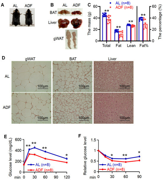 Prolonged alternate day fasting significantly improves systemic metabolism. (A): Representative images of diet-induced obese mice with or without alternate day fasting (ADF) for 15 cycles. (B). Tissue images for gWAT, BAT, and liver in two groups ad libitum (AL) and ADF. (C). 15 cycle-ADF led to body mass loss and fat reduction. Body composition was analyzed by DEXA scanning. (D) Histological analysis of gWAT, BAT, and liver in AL and ADF mice. Glucose tolerance (E) and insulin tolerance (F) were improved by 15 cycle-ADF. Values in (C,E,F) are expressed as mean ± SEM. t-test was utilized to analyze the data for (C) and unpaired two-tailed Student’s t-test was for (E,F). * p < 0.05 and ** p < 0.01.