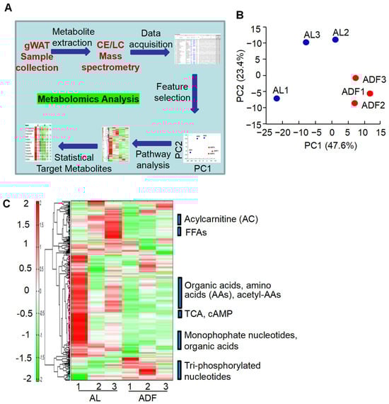 Prolonged alternate day fasting reprograms metabolism in visceral fat. (A). Workflow of adipose tissue metabolomic analysis. (B). Principal component analysis (PCA) of metabolomics and lipidomics results using the detected peaks, PC1, the first principal component; PC2, second principal component. The numbers in parentheses indicate contribution rates, while the plot labels correspond to sample names. (C). Heatmap of adipose tissue metabolites with hierarchical cluster analysis (HCA) in gWAT from ADF and AL groups.