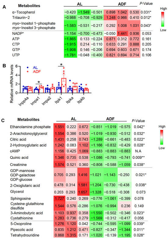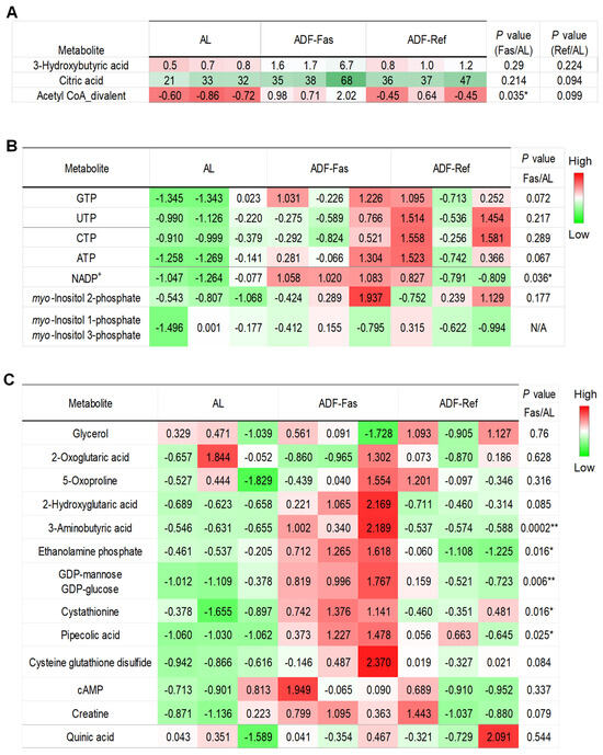 Gradual modulation of InsP1s and triphosphate nucleotides in adipose tissue in response to the fasting regimen. The table summarized the rest of detected and differentially expressed metabolites within gWAT during 3 cycles of ADF under chow diet conditions. The data were quantified for 3-hydroxybutyric acid, citric acid, and acetyl-coA divalent in (A), InsP1s and triphosphate nucleotides in (B), and other metabolites in (C). The p-value is computed by Welch’s t-test. * p < 0.05 and ** p < 0.01.