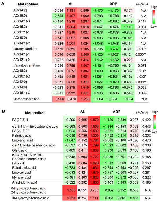 Extended alternate day fasting decreases acylcarnitine (ACs) levels in visceral fat. The table summarized detected and differentially expressed metabolites within gWAT. The data were quantified for individual acylcarnitine (A) and free fatty acids (FFAs) (B). The p-value is computed by Welch’s t-test. * p < 0.05 and ** p < 0.01.