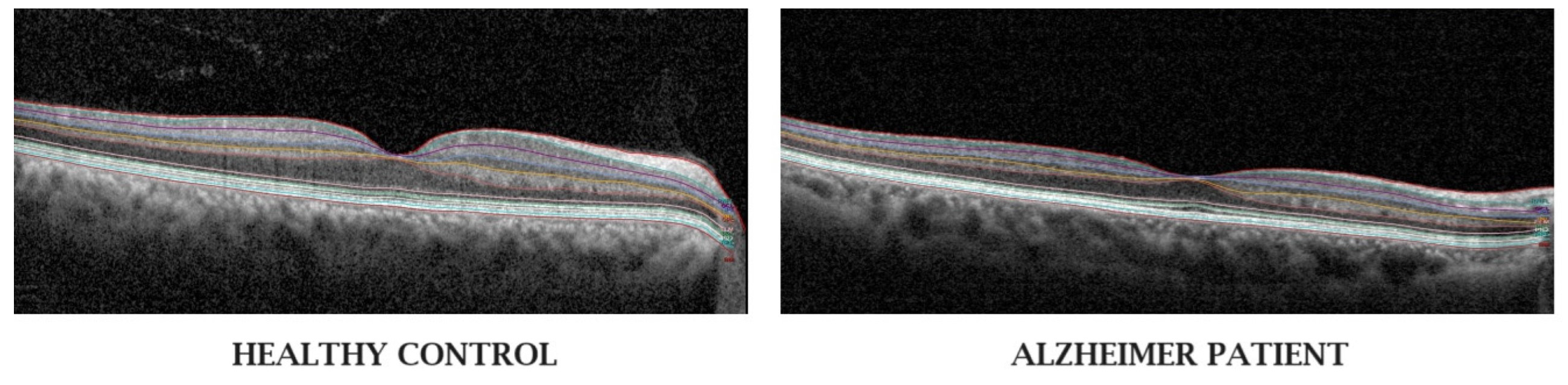 - Garcia-Martin, E.; Jimeno-Huete, D.; Dongil-Moreno, F.J.; Boquete, L.; Sánchez-Morla, E.M.; Miguel-Jiménez, J.M.; López-Dorado, A.; Vilades, E.; Fuertes, M.I.; Pueyo, A.; et al. Differential Study of Retinal Thicknesses in the Eyes of Alzheimer’s Patients, Multiple Sclerosis Patients and Healthy Subjects. Biomedicines 2023, 11, 3126. [Google Scholar] [CrossRef]