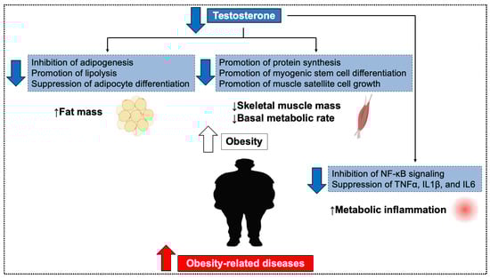 Obesity caused by low testosterone. Decreased testosterone action results in increased fat mass, loss of skeletal muscle mass, and a decrease in basal metabolic rate. Additionally, it increases metabolic inflammation. As a result, the risk of obesity-related diseases is elevated.