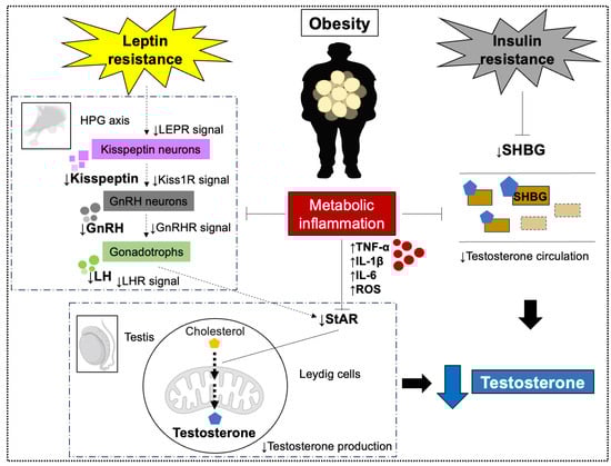 Leptin is a peptide hormone secreted primarily by adipocytes. It acts on hypothalamic kisspeptin neurons to stimulate gonadotropin-releasing hormone (GnRH) secretion [102,103,104,105,106,107,108]. Specifically, leptin binds to receptors (LEPR) on kisspeptin neurons, enhancing kisspeptin release. However, in obesity, leptin resistance develops, LEPR activity decreases, and kisspeptin secretion declines. Consequently, GnRH neuron signaling via the KiSS-1 receptor (Kiss1R) diminishes, reducing GnRH output [103,104,106]. Additionally, some studies have shown that high levels of leptin reduce testosterone production in the testis [109]. LEPRs are expressed in Leydig cells, and elevated leptin reduces expression of steroidogenic acute regulatory protein (StAR), impairing testosterone synthesis [109]. Thus, obesity-induced leptin resistance and hyperleptinemia decrease testosterone production through central and peripheral mechanisms.