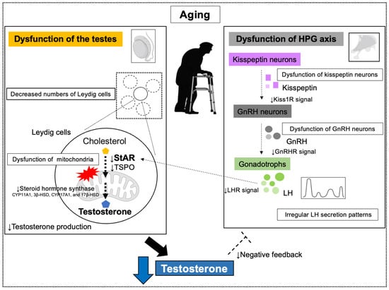 Leydig cells, which produce testosterone in the testes, gradually lose function with aging [126,127,128,129]. Testosterone synthesis in Leydig cells involves LH, StAR, translocation protein (TSPO), and a series of steroid hormone synthases (CYP11A1, 3β-HSD, CYP17A1, and 17β-HSD). When LH acts on Leydig cells, it activates the cAMP pathway. This activation promotes the function of StAR protein and transports cholesterol into the mitochondrial membrane. TSPO is also involved in cholesterol transport to the mitochondrial membrane. Within mitochondria, cholesterol is progressively converted by various steroid hormone synthase to produce pregnenolone and eventually testosterone. In aging men, a reduced responsiveness to LH stimulation has been reported to impair the steroidogenic pathway in Leydig cells [129,130,131]. Furthermore, decreased cAMP production [130,131,132], reduced StAR expression [133,134], lower TSPO levels, and diminished activity of steroidogenic enzymes [135,136,137,138,139] have all been observed. In addition, studies have demonstrated a decline in the number of Leydig cells in older men [140], further contributing to reduced testosterone production capacity.