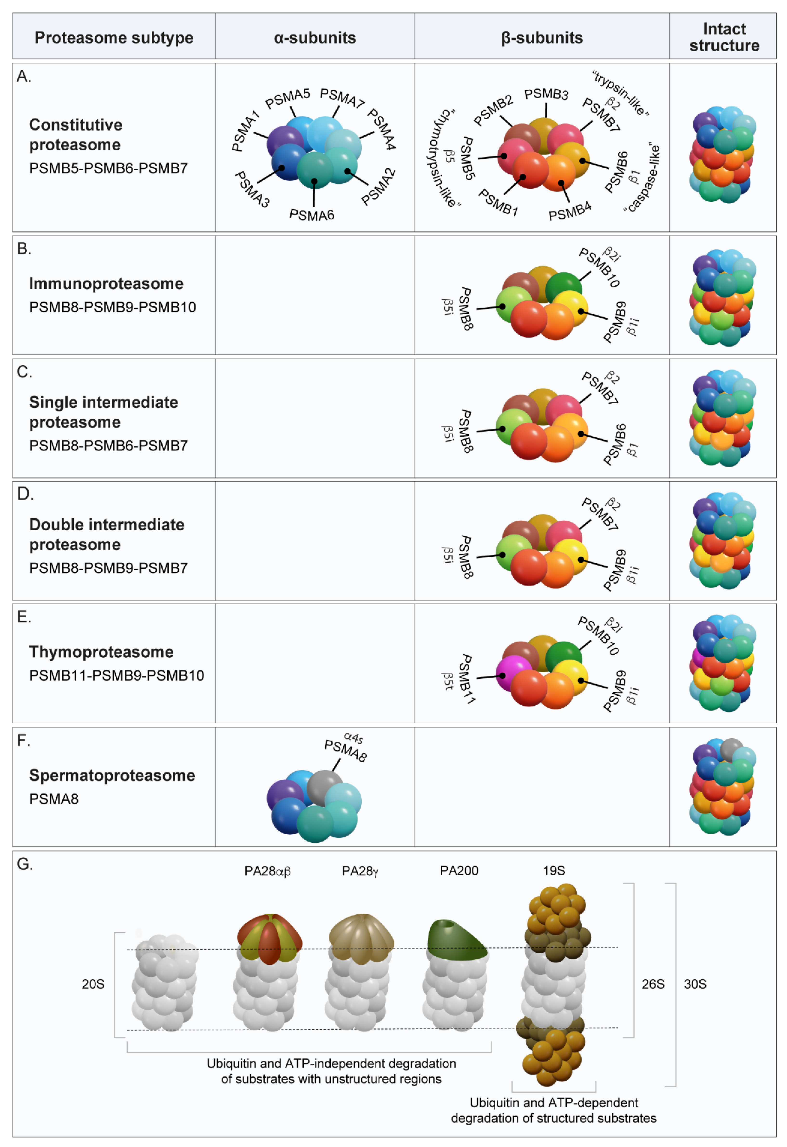 - Klare, N.; Seeger, M.; Janek, K.; Jungblut, P.R.; Dahlmann, B. Intermediate-type 20 S proteasomes in HeLa cells: “asymmetric” subunit composition, diversity and adaptation. J. Mol. Biol. 2007, 373, 1–10. [Google Scholar] [CrossRef]