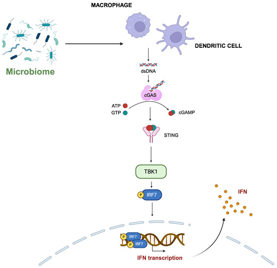 - Lam, K.C.; Araya, R.E.; Huang, A.; Chen, Q.; Di Modica, M.; Rodrigues, R.R.; Lopès, A.; Johnson, S.B.; Schwarz, B.; Bohrnsen, E.; et al. Microbiota Triggers STING-Type I IFN-Dependent Monocyte Reprogramming of the Tumor Microenvironment. Cell 2021, 184, 5338–5356.e21. [Google Scholar] [CrossRef]