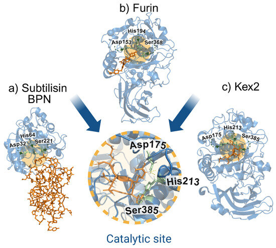 Common catalytic site among subtilisin-like serine proteases: subtilisin BPN, furin, and Kex2. (a) Structure of the complex of subtilisin BPN and Streptomyces subtilisin inhibitor (SSI), (PDB: 2SIC). (b) Structure of human furin bound to BOS-318, a small-molecule peptidomimetic inhibitor targeting its active site (PDB: 2ID4). (c) Crystal structure of yeast Kex2 protease in complex with a peptidyl-chloromethylketone inhibitor (PDB: 2ID4). The central inset highlights the conserved catalytic triad (Asp–His–Ser) shared among all three enzymes, characteristic of the subtilisin-like serine protease family.