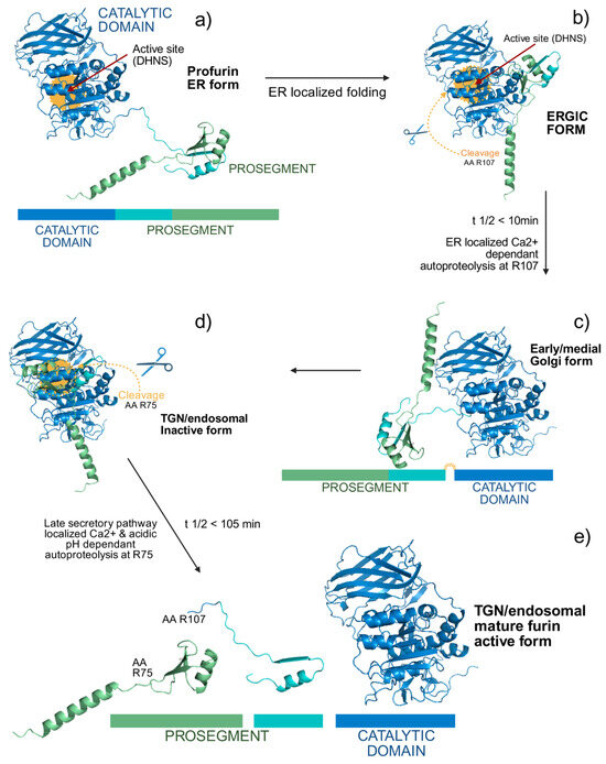 Furin initially exists as an inactive precursor (profurin, with a molecular weight of ap-proximately 100 kDa) and becomes active through a two-step autocatalytic process. The autolytic cleavage results in the formation of an active 90 kDa enzyme, characterized by N-terminal truncation [52,53,60]. After being synthesized in the endoplasmic reticulum (ER), furin begins its activation process as an inactive zymogen. During the initial stage, the signal peptide is removed, and the proenzyme undergoes N-glycosylation at multiple sites, modifications that are crucial for proper folding in the ER. Because of the acidic pH and reductive environment within the ER, furin employs its intrinsic catalytic activity to initiate maturation. This occurs via an autocatalytic cleavage event at the RTKR107↓ motif, delineating the boundary between its catalytic domain and the prosegment region (Figure 3).