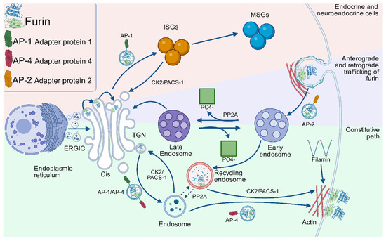 Intracellular trafficking pathways of furin in different cellular compartments. The schematic illustrates three distinct trafficking routes of furin, each color-coded to represent specific cellular processes: The red pathway depicts endocrine/neuroendocrine cell-specific trafficking, where AP-1 mediates furin budding from the trans-Golgi network (TGN) to immature secretory granules (ISGs). In this pathway, phosphofurin acidic cluster sorting protein 1 (PACS-1) functions as an adaptor, linking CK2-phosphorylated furin to the AP-1/clathrin machinery for TGN retrieval. Alternatively, furin-containing vesicles may progress to mature secretory granules (MSGs) for hormone processing. The green pathway represents basolateral targeting, where AP-4 directs furin transport from either the TGN or endosomal compartments to the basolateral membrane. At the membrane, filamin (ABP-280) anchors furin to the actin cytoskeletal network. The blue pathway encompasses complex bidirectional trafficking between multiple compartments. Furin internalization from the plasma membrane occurs via clathrin and dynamin-dependent endocytosis, primarily mediated by tyrosine-based motifs interacting with AP-2. During endosomal transit, PX domain-containing phosphoinositide-binding proteins modulate furin sorting. Early endosomes serve as decision points (1). PP2A-mediated dephosphorylation targets furin for TGN return via late endosomal intermediates, with phosphate release (2). CK2-phosphorylated furin undergoes PACS-1-dependent recycling to the plasma membrane. Dashed lines indicate the putative PP2A-dependent route from post-TGN endosomal compartments to the cell surface. Throughout these pathways, CK2 and PACS-1 participate at multiple trafficking nodes, highlighting their central role in furin localization dynamics. This integrated model demonstrates how post-translational modifications (phosphorylation and dephosphorylation) together with adaptor protein interactions coordinate furin’s subcellular distribution and functional specialization across different cell types. Figure Modified from Thomas et al. (2002) [55].