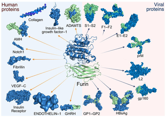 These elements are essential for the proper functioning and homeostasis of the human body. However, furin has also been potentially linked to pathophysiological processes, such as neurodegenerative or neuropsychiatric disorders (e.g., Alzheimer’s, schizophrenia, epilepsy, or ischemia) [97], type 2 diabetes mellitus [13], arterial hypertension [98], the development of atherosclerosis and cardiovascular diseases [6], the progression of tumors or cancer (carcinomas, sarcomas, skin cancer, as well as brain or central nervous system tumors) [99], and the activation of bacterial toxins (e.g., anthrax, diphtheria, Pseudomonas, and Shiga toxins), this proetolytic process is crucial for the separation of A subunit from the membrane-associated B subunit, which allows it to exert the toxic effect [100,101,102,103,104]. In addition to its role in physiological processes, furin also participates in the activation of viral glycoproteins, linking it to the pathogenesis of a wide range of viral infections (Figure 5) [20].