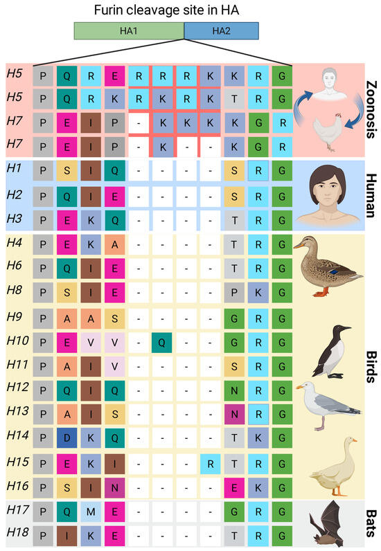 Comparative alignment of influenza hemagglutinin cleavage sites. The multiple sequence alignment depicts the evolutionary divergence in hemagglutinin (HA) cleavage site motifs among influenza A virus subtypes. Human-adapted subtypes (H1, H2, and H3) typically possess monobasic cleavage sites. In contrast, the highly pathogenic avian influenza subtypes H5 and H7 may harbor a polybasic cleavage motifs that enable furin-mediated proteolytic activation, significantly enhancing viral pathogenicity. Notably, subtypes H4 through H18 (excluding H5 and H7) consistently lack polybasic cleavage sites, maintaining the ancestral monobasic configuration. The alignment, generated using CLUSTAL Omega v. 1.2.2, includes representative sequences from Spanish influenza H1N1 (AAD17229.1); H2N9 (ADU17660.1); seasonal H3N2 (ABD59856.1); avian H4N6 (AHL82211.1), H5N1 (AAD13569.1), H5N2 (AAC58990.1), H6N8 (AKF34349.1), H7N7, (AAC54377.1), H7N? (AAC54381.1) H8N4 (CAY39405.1), H9N2 (AAV68030.1), H10N7 (ADP07130.1), H11N2 (AHZ21120.1), H12N6 (AGG84126.1), H13N9 (ADB46159.1), H14N3 (AHJ57334.1), H15N2 (ABB90704.1), H16N3 (BAO94331.1); bat-derived H17N10 (AFC35438.1): and H18N11 (AKC43903.1). This comprehensive phylogenetic comparison highlights the exceptional nature of polybasic cleavage site acquisition in H5 and H7 subtypes, a key molecular determinant of influenza virulence and host range.