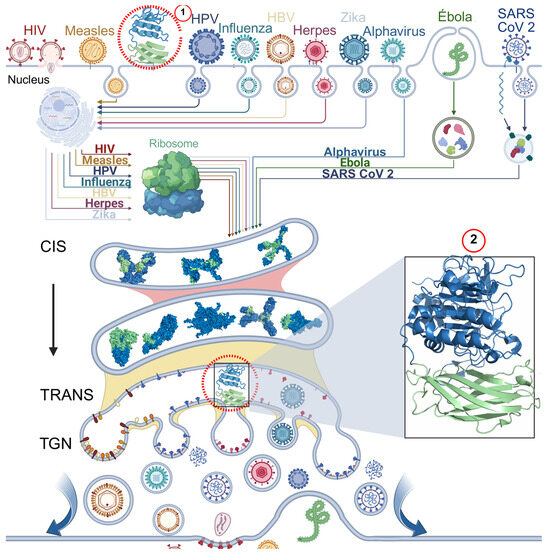 Schematic overview of viral entry and furin-mediated processing of viral proteins in the trans-Golgi network (TGN). The diagram depicts the cis- and trans-Golgi compartments, emphasizing the localization of furin within the TGN, where it cleaves viral precursor proteins at specific basic motifs. Representative viruses utilizing this pathway include: HIV (gp160 → gp120/gp41), measles virus (F0 → F1/F2), human papillomavirus (HPV L2 protein), influenza virus (hemagglutinin HA0 → HA1/HA2), and herpesviruses [glycoprotein B (gB) precursor]. These proteolytic events, occurring during transit through the TGN, are essential for viral maturation, membrane fusion capacity, and infectivity, Furin (PDB: 5JXG).