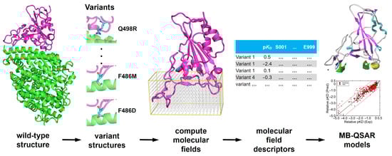 The MB-QSAR method is based on the small molecule 3D-QSAR methodology [52,53] but performed on a series of protein variants. In this approach, the structural information of studied protein variants was represented as 3D molecular field parameters. The region of interest of the protein variants was embedded in a grid lattice, and the molecular field parameters (such as steric and electrostatic potentials) were calculated with probe atoms. Partial least squares (PLS) regression was employed to associate the molecular field parameters and the experimentally determined properties to construct the prediction model (Figure 1).