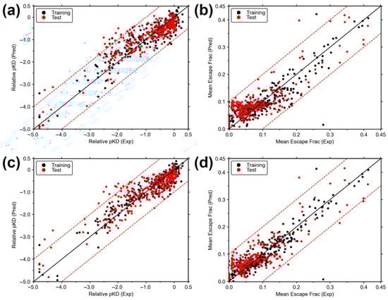 Plots of the experimental and predicted mutational effect values in the MB-QSAR CoMFA and CoMSIA models. (a,b): CoMFA model for RBD-hACE2 RBD-antibodies, respectively; (c,d): CoMSIA model for RBD-hACE2 and RBD-antibodies, respectively. The values from the training and test sets are shown in black and red dots, respectively. The black line represents the identity between the experimental and the predicted values, while the red dashed lines display 1.0 and 0.1 value errors from identity for RBD-hACE2 and RBD-antibodies, respectively.
