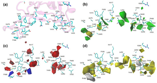 For the MB-QSAR model of RBD variants to antibodies (Figure 6), we also found a strong correlation between the fields near RBD residues and the effect of mutations of these residues. For example, in the electrostatic field, blue contours were found near residue E484, N487, and F486; red contours were found near R346, K417, Y449, A475, F486, N487, and F490. This is consistent with the fact that the mutation of E484, N487, and F486 to the positively charged residue and the mutation of R346, K417, Y449, A475, F486, N487, and F490 to negatively charged residues can increase the escape fraction of RBD.