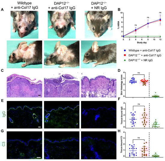 3.1. Loss of DAP12 Does Not Impact Disease Activity in Anti-Col17 IgG-Induced BP