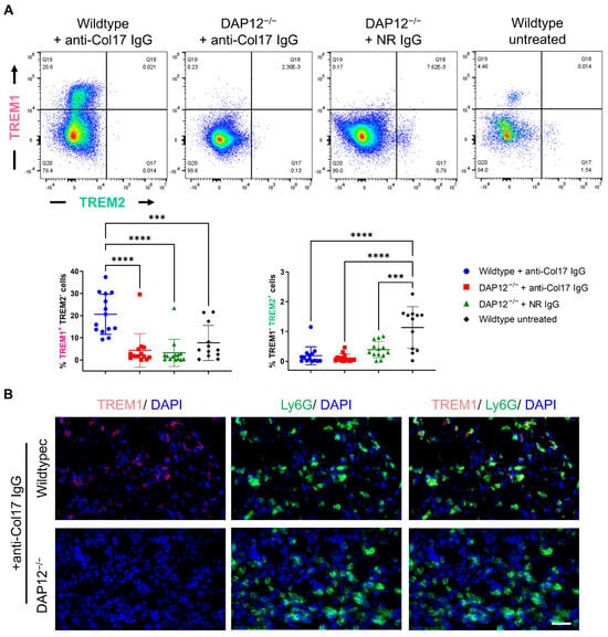 Although disease activity did not differ between DAP12−/− and wildtype mice, we further examined lesional skin biopsies by flow cytometry to characterize potential molecular alterations underlying disease pathogenesis. Anti-Col17 IgG treatment induced marked upregulation of the DAP12-associated receptor TREM1 in wildtype mice, whereas expression remained low in DAP12−/− mice and untreated wildtype controls (p < 0.001; n ≤ 14/group) (Figure 2A). Indirect IF analysis confirmed the pronounced reduction in TREM1 expression in anti-Col17 IgG-treated DAP12−/− mice compared with wildtype controls, particularly in Ly6G+ neutrophil-rich regions (Figure 2B). In contrast, TREM2+ cells were significantly decreased in anti-Col17 IgG-treated wildtype mice as well as in both DAP12−/− groups, compared with healthy skin from untreated mice, in which moderate TREM2 expression was detectable (p < 0.001; n ≤ 14/group) (Figure 2A).