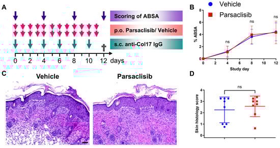 Inhibition of the PI3Kδ isoform does not alter disease activity in anti-Col17 IgG-induced bullous pemphigoid. (A) Study design. (B) Affected body surface area (ABSA) in parsaclisib vs. vehicle-treated mice (two-way ANOVA with Sidak’s multiple comparison test; n = 16/group). (C,D) Hematoxylin & eosin staining and histopathological scoring of lesional skin (Mann–Whitney test; n = 8/group). Scale bars = 50 μm. ns, not significant; p.o., per os; s.c., subcutaneous. Data are presented as mean ± standard deviation.