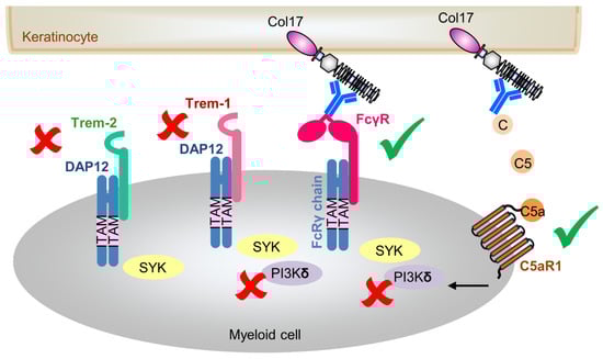 Given the absence of overt effects of DAP12 deficiency in our BP model, we next asked whether associated signaling partners might be affected or compensate for its absence. We have previously demonstrated that anti-Col17 IgG-mediated BP is partially driven by complement C5a/C5aR1 and Fc gamma receptor (FcγR)-dependent mechanisms (Figure 5) [,]. In myeloid cells, activating FcγRs and DAP12 represent the principal ITAM-containing signaling adapters [,]. These adaptors provide docking sites for kinases, thereby amplifying intracellular signaling cascades [,]. The cytoplasmic DAP12 ITAM unit is crucial for functional integrity of cell surface receptors such as TREMs who lack signaling motifs []. Like DAP12, TREMs are expressed on diverse myeloid subsets, including granulocytes, monocytes, and tissue macrophages, and have been implicated in both inflammation and autoimmunity []. We therefore examined the expression of two key members of this family, TREM1 and TREM2, both of which are present in humans and mice. Upon TREM crosslinking, the tyrosine residues within the ITAM motif of DAP12 become phosphorylated, leading to the recruitment of SYK tyrosine kinases and subsequent activation of downstream signaling cascades, including PI3K [,]. Notably, TREM1 and TREM2 appear to exert largely opposing functions with TREM1 acting as an amplifier of inflammation and TREM2 eliciting anti-inflammatory responses [,]; however, both receptors can also exert similar inflammatory responses, such as in the gut environment, and their functions may vary depending on the cell type involved []. In our study, TREM1 expression was strongly reduced in DAP12−/− skin, but increased in wildtype BP skin, yet this did not translate into functional differences in disease outcome. This finding is consistent with prior work demonstrating that altered TREM1 expression in inflamed skin has no significant impact on the pathogenesis of cutaneous disorders, such as psoriasiform dermatitis, contact dermatitis, and epidermolysis bullosa acquisita (EBA) []. It further supports the view that TREM1 function is primarily driven by microbial rather than sterile inflammatory stimuli [,,]. Similarly, TREM2 expression was markedly reduced in anti-Col17 IgG-treated wildtype mice as well as in DAP12−/− mice compared with untreated control skin, but this reduction also appeared irrelevant to BP pathogenesis. These data align with the notion that TREM2 functions mainly in lipid homeostasis and hair growth rather than in autoantibody-driven inflammation [,,].