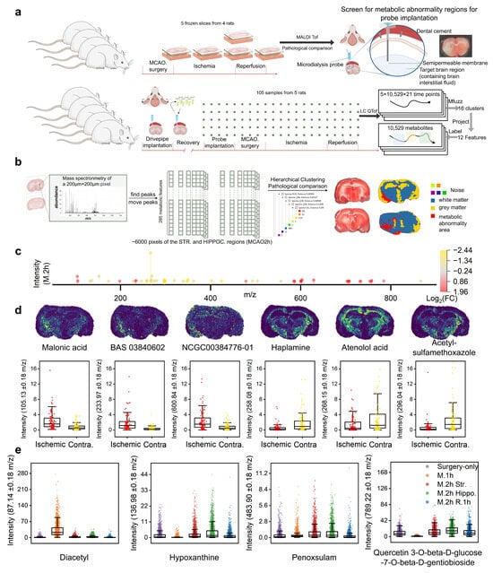 The following supporting information can be downloaded at: https://www.mdpi.com/article/10.3390/biom15111558/s1, Figure S1: TTC-stained brain slices from different groups; Figure S2: MALDI results from coronal sections of MCAo 2 h; Figure S3: MALDI results from coronal sections of MCAo 2 h reperfusion 1 h, the only surgery group and MCAo 1 h; Figure S4: The complete surgical procedure and corresponding stages of injury; Figure S5: Hierarchical cluster analysis (HCA) of metabolites labeled with KEGG tags (A–P); Figure S6: KEGG pathway analysis of brain injury related to metabolites from stereotactic probe insertion; Figure S7: KEGG pathway analysis of brain injury related to metabolites associated with subsequent metabolic changes caused by MCAo and surgery; Figure S8: Valine, leucine, and isoleucine biosynthesis pathway metabolites analysis; Figure S9: Glutathione metabolism pathway metabolites analysis; Figure S10: Tyrosine metabolism pathway metabolites analysis; Figure S11: Pyrimidine metabolism pathway metabolites analysis; Figure S12: Parameter settings for each dimension in PLS-R (partial least squares regression); Figure S13: Unfolding of 10,529-dimensional metabolic features using i-PCA (incremental principal component analysis); Figure S14: ROC curves for stage determination using the top 10 metabolites with the highest VIP (variable importance in projection) values for each component; Table S1: Metabolic features upregulated in the metabolic abnormality area of the ischemic hemisphere; Table S2: Metabolic features downregulated in the metabolic abnormality area of the ischemic hemisphere.