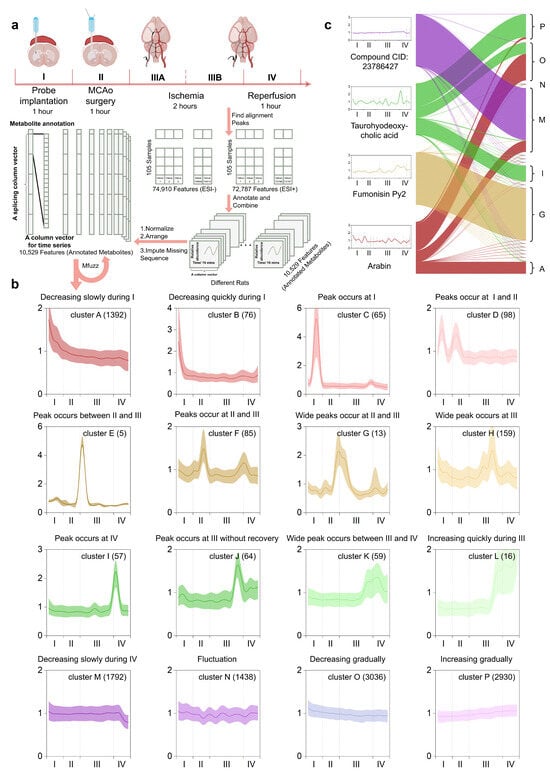 Figure 2. MFuzz-based metabolite feature annotation: (a) The entire procedure was operationally segmented into five phases: Phase I (probe implantation), Phase II (MCAO filament insertion), Phase IIIA (early ischemia), Phase IIIB (late ischemia), and Phase IV (reperfusion). Metabolic fingerprints of each time-stamped microdialysate were pre-processed, binarized, and stacked into high-dimensional column vectors for optimal fuzzifier estimation and Mfuzz clustering. (b) 16 Mfuzz-extracted temporal trajectories were annotated according to their characteristic dynamics across the defined metabolic phases. (c) Mfuzz-derived 16 metabolic labels were mapped onto tag-connecting plots for four representative metabolites.