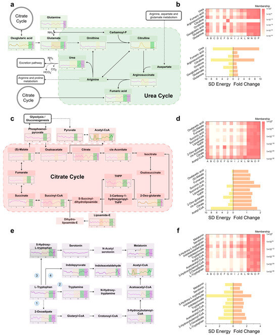 Figure 4. Dominant metabolic pathways and their characteristics during MCAO/R progression: (a) Expansion of metabolite profiles within the KEGG-defined “Arginine biosynthesis” pathway implicated in direct ischemic injury. (b) Top: cluster-label mapping for arginine-biosynthesis metabolites. Bottom: SD Energy (global temporal fluctuation) and key-time fold change (signature-period fold change). (c) Expansion of metabolite profiles within the KEGG-defined “Citarate circle” pathway implicated in reperfusion-induced acute injury. (d) Top: cluster-label mapping for Citarate circle metabolites. Bottom: SD energy and key-time fold change. (e) Expansion of metabolite profiles within the KEGG-defined “Tryptophan metabolism” pathway implicated in sustained reperfusion injury. The numbers 1–4 correspond to the four consumption pathways in tyrosine-centered metabolism. (f) Top: cluster-label mapping for tryptophan-metabolic metabolites. Bottom: SD energy and key-time fold change.