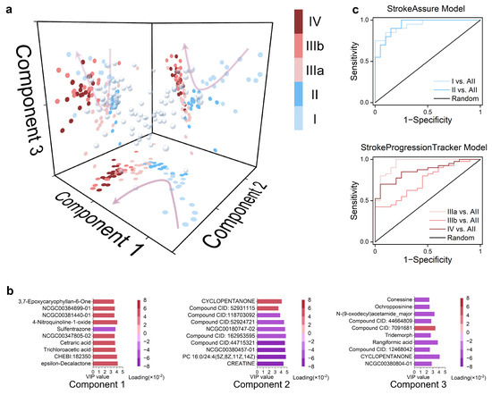 Figure 5. StrokeAssure and StrokeProgressionTracker models for screening stroke biomarkers using PLS-R and Lasso Penalt: (a) Scatter plot obtained from the interaction of the first three components derived from PLS-R performed on 10,529 metabolites based on the stage classification of all samples, with colors indicating the stage of the samples. (b) The top 10 metabolites with the highest VIP values for each Component obtained in (a), with colors representing the loadings for the components. (c) ROC curves for predicting the pre-stroke stage using the five metabolites in Component 1 and the six metabolites in Components 2 and 3, respectively, after LASSO regression was applied to the top ten metabolites with the highest VIP values for each Component obtained in (a).