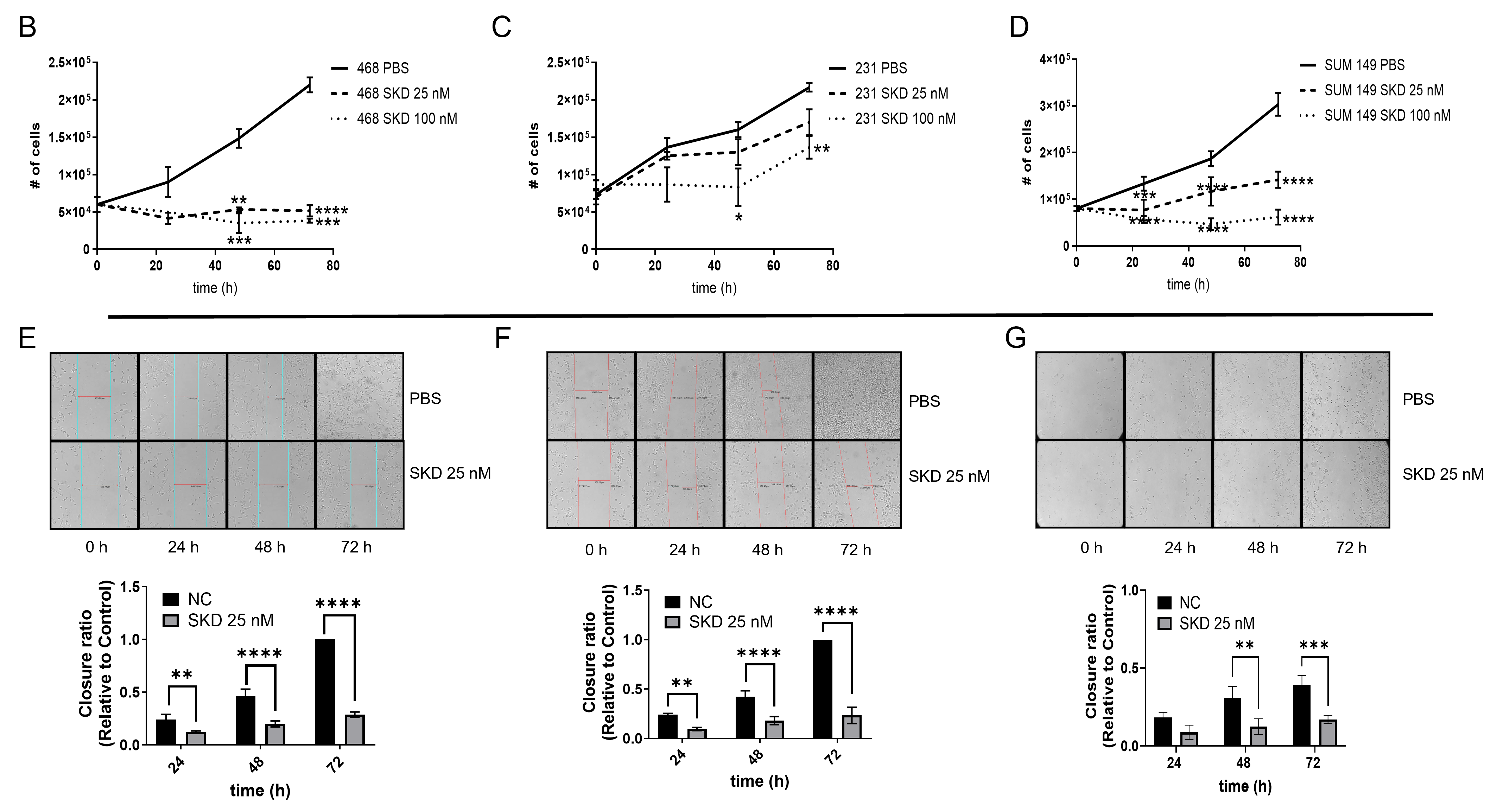 Figure 1. Cytotoxic effect of SKD in MDA-MB-231, MDA-MB-468 and SUM-149 cells. (A) Dose–response curves for MDA-MB-231 MDA-MB-468 and SUM-149 cells treated with Doxorubicin, Cisplatin or SKD. (BD) Proliferation rates of MDA-MB-468, MDA-MB-231 and SUM-149 cells at 24, 48, and 72 h following treatment with 25 nM and 100 nM SKD. Wound healing assay in (E) MDA-MB-231, (F) MDA-MB-468, (G) SUM-149 following SKD treatment. Cells were treated with SKD 25 nM for 72 h. Bars: triplicates +/− SD. (* p < 0.05, ** p < 0.01, *** p < 0.001, **** p < 0.0001).
