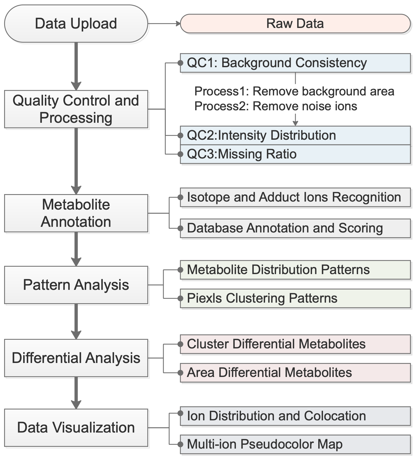 Despite some progress in certain aspects of spatial metabolomics data analysis, particularly in peak detection and extraction, existing tools still show notable deficiencies in crucial downstream analytical processes, including systematic data preprocessing, comprehensive quality control, and in-depth statistical analysis [