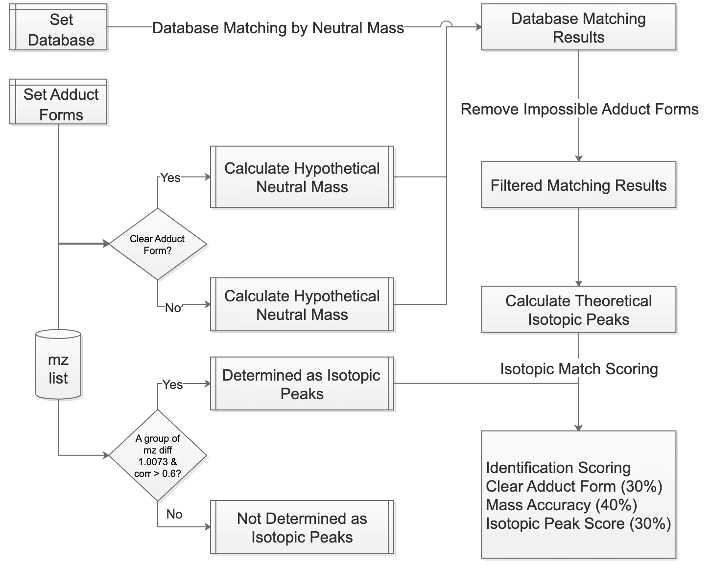 Figure 2) comprises two core steps: (1) ion peak relationship identification and (2) database matching and scoring. First, the software identifies isotopic peaks and adduct ions within the