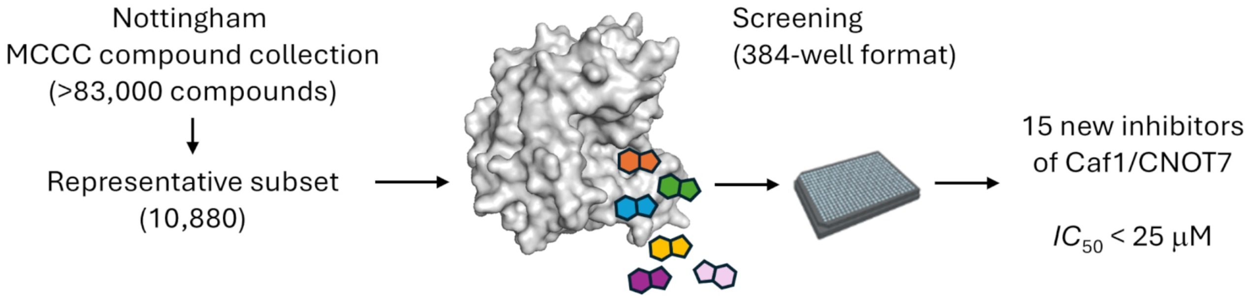 Because our previously identified inhibitors displayed limited potency, we aimed to identify new starting points for the development of more potent inhibitors. To identify new, structurally unrelated inhibitors, we set out to screen a library of 10,880 synthetic compounds that were selected based on structural diversity and drug-likeness using our previously described fluorescence-based assay. Using this approach, we discovered 15 drug-like inhibitors with IC50 values below 25 μM. A further six inhibitors were identified with IC50 values ranging from 50 to 230 μM. The compounds reported here may be useful as pharmacological tools to analyse the function of Caf1/CNOT7 as an alternative to genetic approaches, and are valuable starting points for the development of more potent inhibitors of Caf1/CNOT7 using medicinal chemistry.
