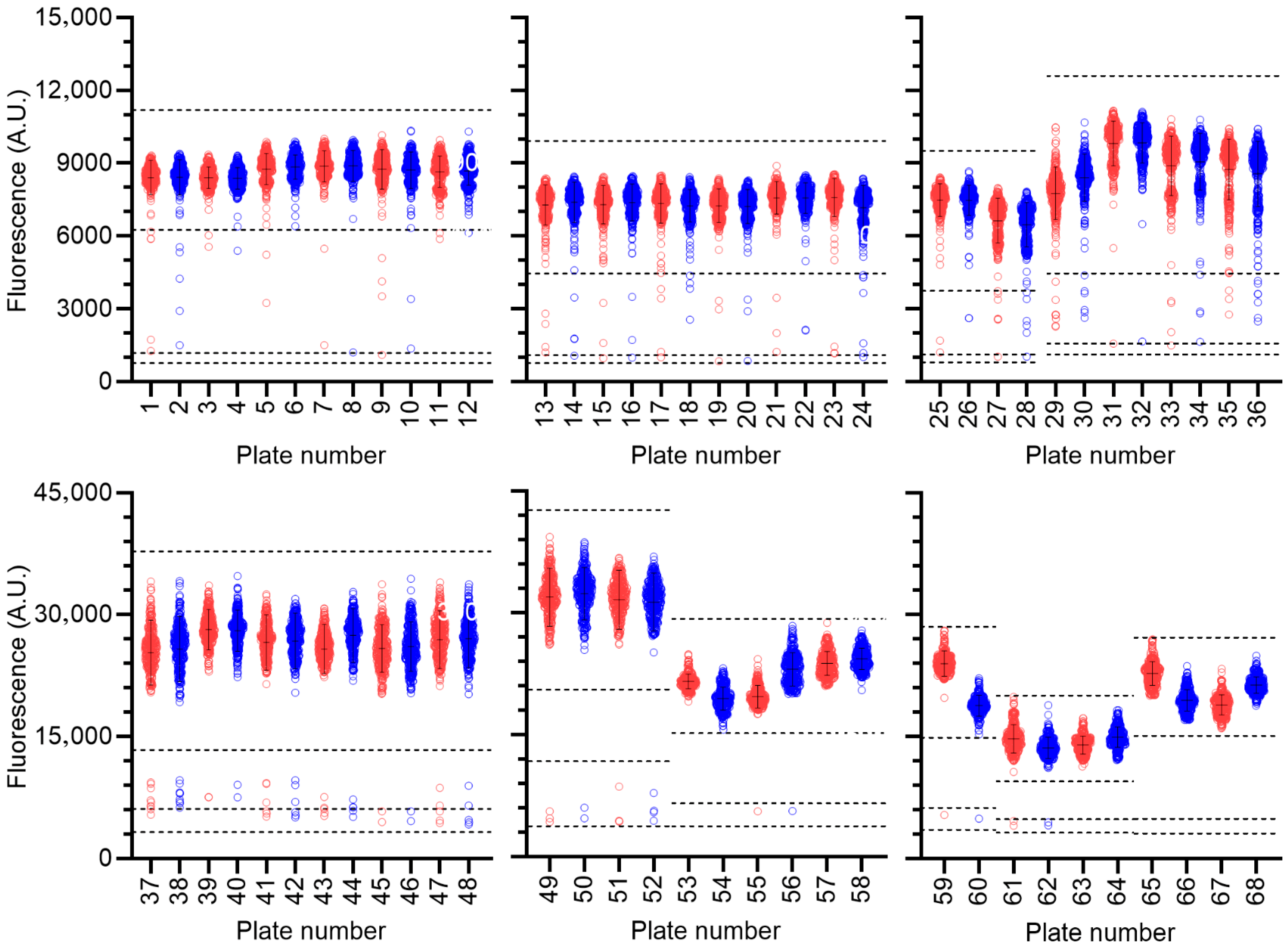 Figure 2. Compound screening. Compounds (n = 10,880) were screened in duplicate using 320 library compounds per plate. Duplicate plates are indicated in red (odd numbers) and blue (even numbers), respectively. Error bars represent the mean and standard deviation of wells containing library compounds for each plate. Dotted lines represent largest 3’ standard deviations of the wells containing library compounds and negative control ± 3’ standard deviations.