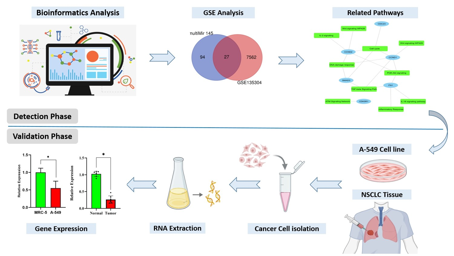 The present study obtained the Institutional Ethical Committee and Research Advisory Committee of Shahid Beheshti University of Medical Sciences (IR.SBMU.MSP.REC.1409.397). The obtained date of approval code was 24 October 2023. Also, to take the patients’ tissues, informed written consent has been obtained for participation in the study. Total RNA was isolated from paired tumor and normal lung tissues of seven NSCLC patients (collected during curative resection) and cultured cell lines using RNX Plus solution (SinaClone, Tehran, Iran; Cat# EX6101) according to the manufacturer’s protocol. The NSCLC cell line A549 [(ATCC® CCL-185™) and (RRID: CVCL_0023)] and normal lung cell line MRC-5 [(ATCC® CCL-171™) and (RRID: CVCL_ 0440)] were purchased from the Pasteur Institute of Iran. Both human cell lines were tested for lung carcinoma and characterized by STR-profiling as indicated by the DSMZ online catalogue [12]. Cell lines were maintained in DMEM supplemented with 10% fetal bovine serum at 37 °C/5% CO2. RNA concentration and purity was verified using NanoDrop 2000c (Thermo Scientific, Waltham, MA, USA; A260/A280 ratio 1.8–2.0) with subsequent storage at −80 °C.