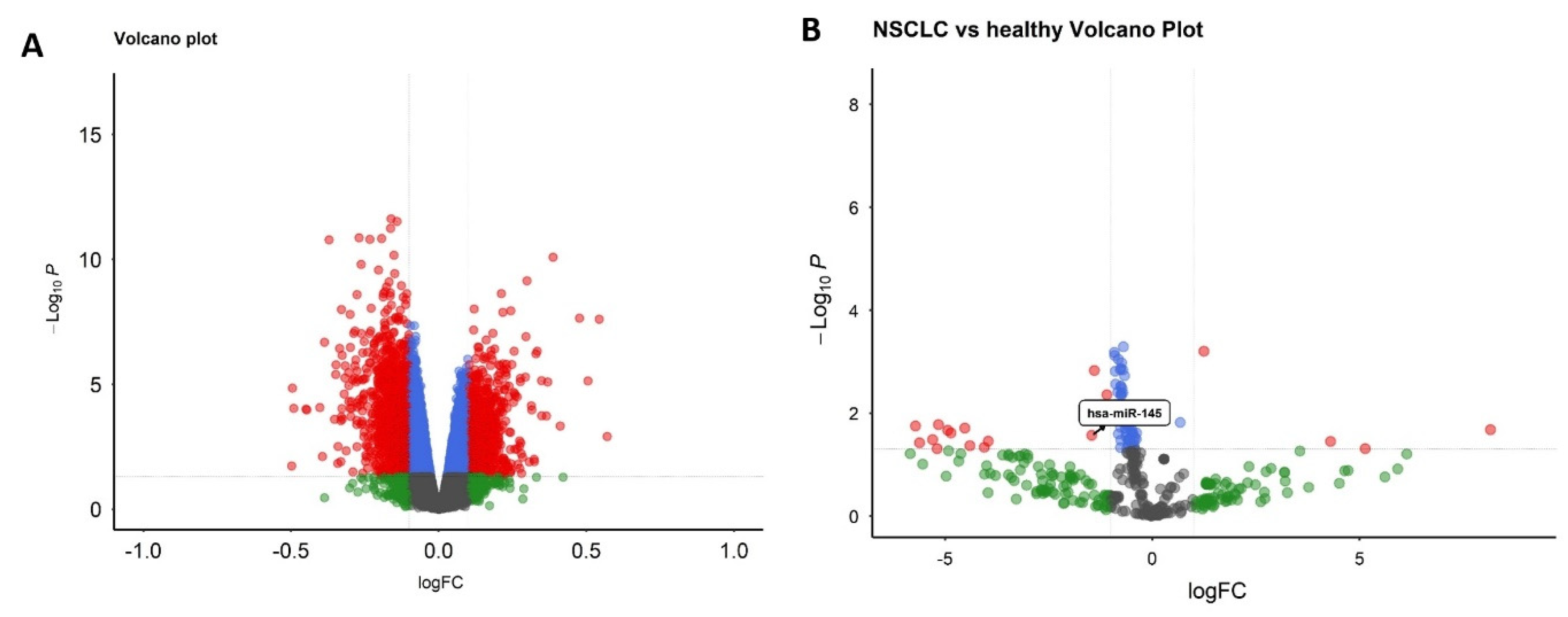 Figure 1. Differential expression in NSCLC: (A) genes (GSE135304), (B) miRNAs (GSE203510).