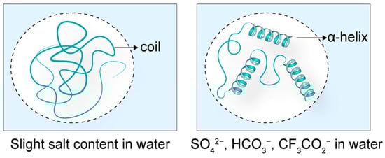 The spatial structure of peptides is intrinsically linked to their biological activity, with counter-ions being a key factor influencing peptide conformation and, consequently, their function. For instance, the antimicrobial peptide LL-37 exhibits a disordered structure in aqueous solutions, resulting in diminished antibacterial activity. However, in the presence of counter-ions such as SO42−, HCO3−, and CF3CO2−, LL-37 adopts an α-helical conformation, significantly enhancing its antimicrobial efficacy (Figure 3) [12]. This demonstrates the critical role of counter-ions in modulating peptide secondary structure.