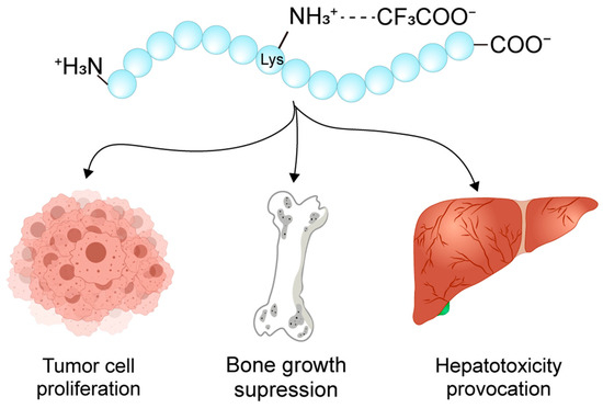 Schematic diagram of the peptide toxicity in the TFA salt form. TFA has been shown to contribute to glioma cell proliferation, osteoblast and articular chondrocyte damage, as well as acute liver injury.