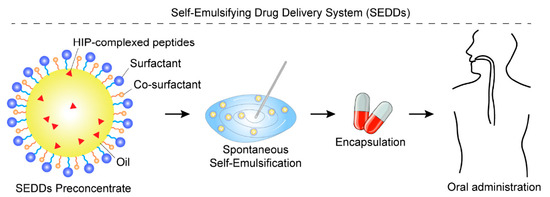 The SEDDs are an innovative formulation, typically existing in either solid or liquid states, that comprises three key components: an oil phase, a non-ionic surfactant, and a cosurfactant (Figure 7). A significant advancement in this field has been the incorporation of HIP, formed through counter-ion interactions, which have been shown to enhance the oral bioavailability of peptide drugs while simultaneously providing robust protection against enzymatic degradation. It was reported that the lipophilicity of insulin glargine (IG) was successfully increased via HIP with sodium octadecyl sulfate to enable incorporation into SEDDS [49], and a significant advancement arose in enhancing the oral bioavailability of insulin IG through the innovative use of the polyglycerol/zwitterion-based SEDDS [50]. A landmark study utilizing leuprorelin as a model peptide drug demonstrated the efficacy of self-microemulsifying drug delivery systems in shielding against luminal enzymatic metabolism [51]. This pioneering research marked the first successful integration of HIP into SEDDs for peptide drug delivery, providing compelling evidence of its protective effects against enzymatic degradation. These findings underscore the potential of SEDDs as a transformative platform technology for improving the oral bioavailability of peptide therapeutics.