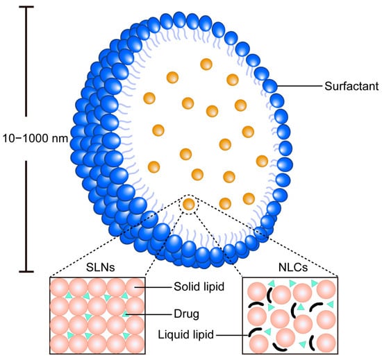 Schematic diagram of the SLN system and NLCs. SLNs comprise a solid lipid core stabilized by surfactants, providing a rigid matrix for sustained drug release. NLCs feature a blended solid–liquid lipid matrix that creates structural imperfections, enabling higher drug loading capacity.