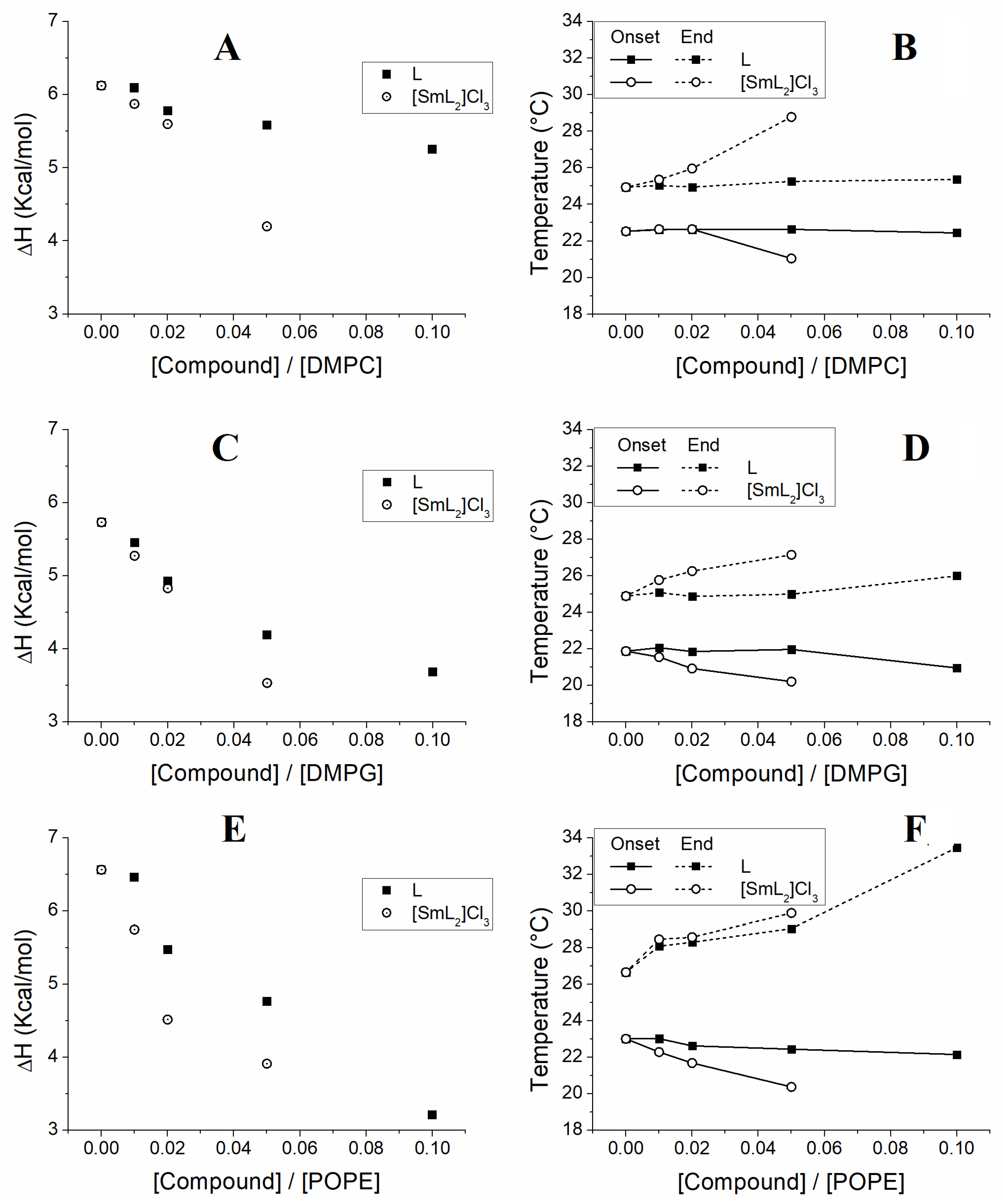 | [Compound]/ [Lipid] | Molar Ratio (L:C) | DMPC/L | DMPC/[SmL2]Cl3 | DMPG/L | DMPG/[SmL2]Cl3 | POPE/L | POPE/[SmL2]Cl3 | ||||||