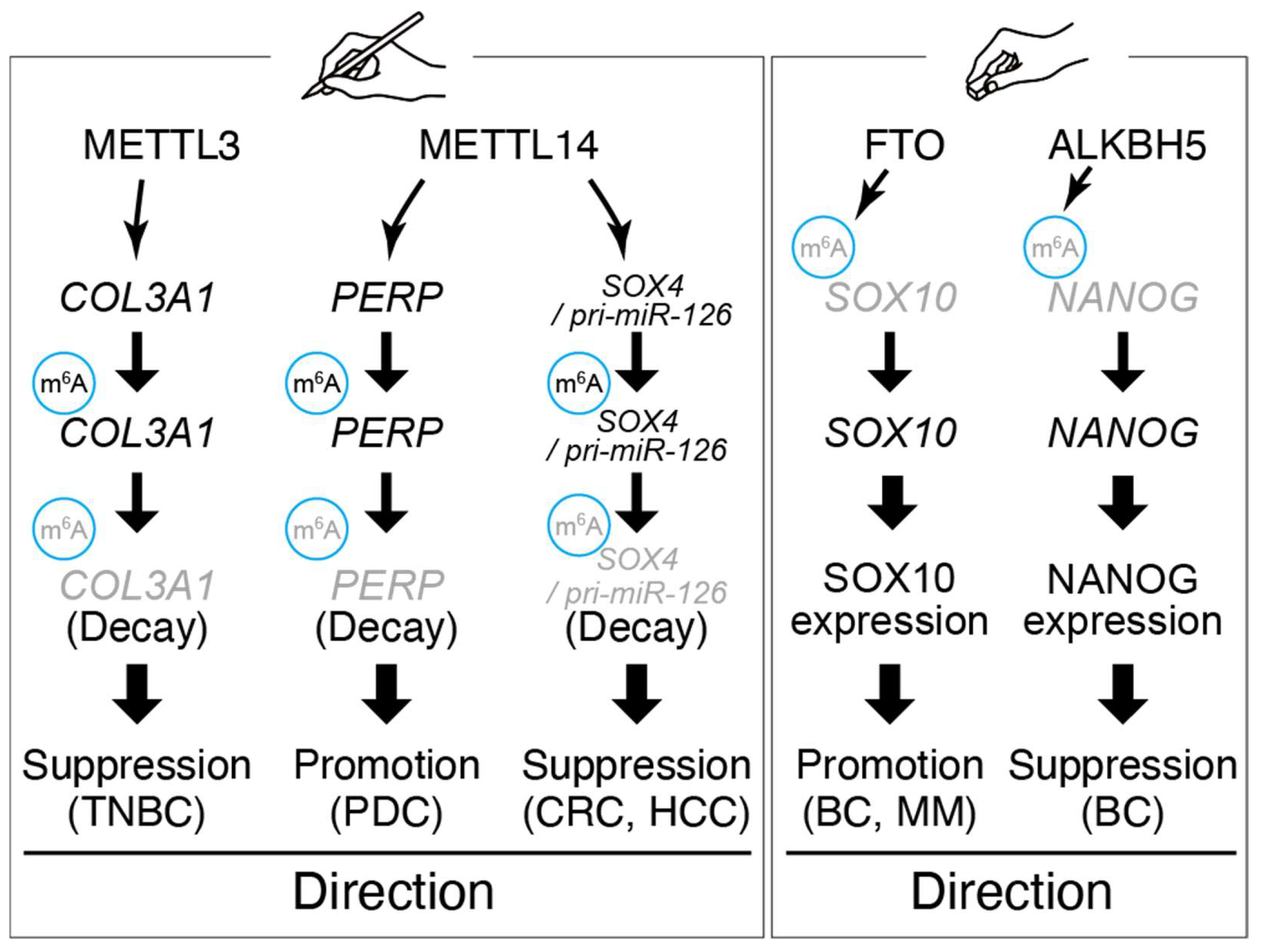 | Suppressive | Removal of m6A on metastasis-suppressive mRNA by ALKBH5 | C, F, A | [69] | |