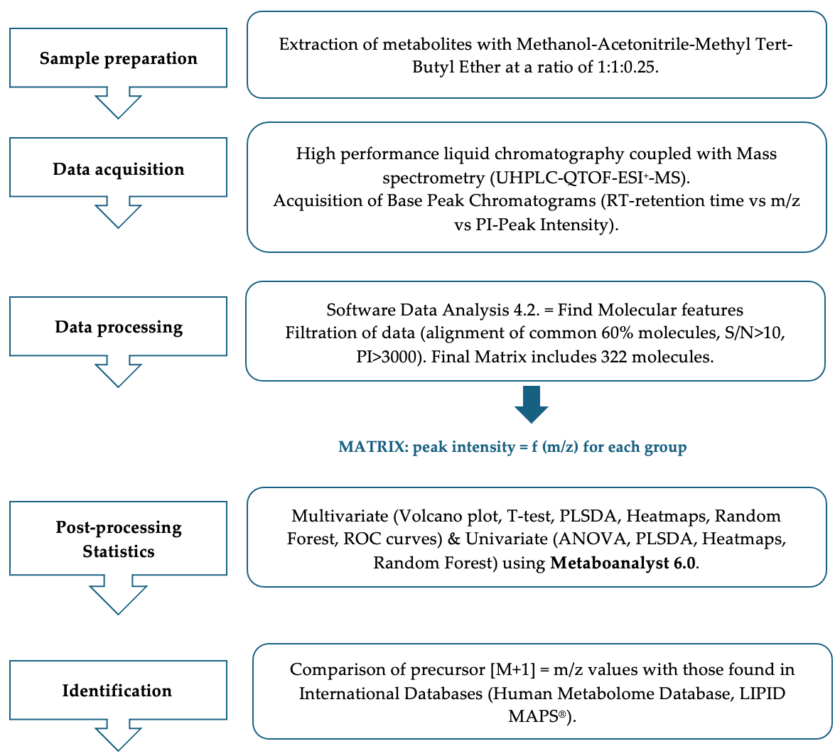 The MS parameters were set for a mass range between 100 and 1000 Da. The nebulizing gas pressure was set at 2.8 bar, the drying gas flow at 12 L/min, and the drying gas temperature at 300 °C. During each chromatographic run, a calibration with Sodium formate was performed. The control of the instrument and data processing used the specific software provided by Bruker Daltonics, namely Chromeleon (7.2 version), TofControl 3.2, Hystar 3.2, and Data Analysis 4.2. The steps of the whole methodology applied in this case are presented in Figure 1.