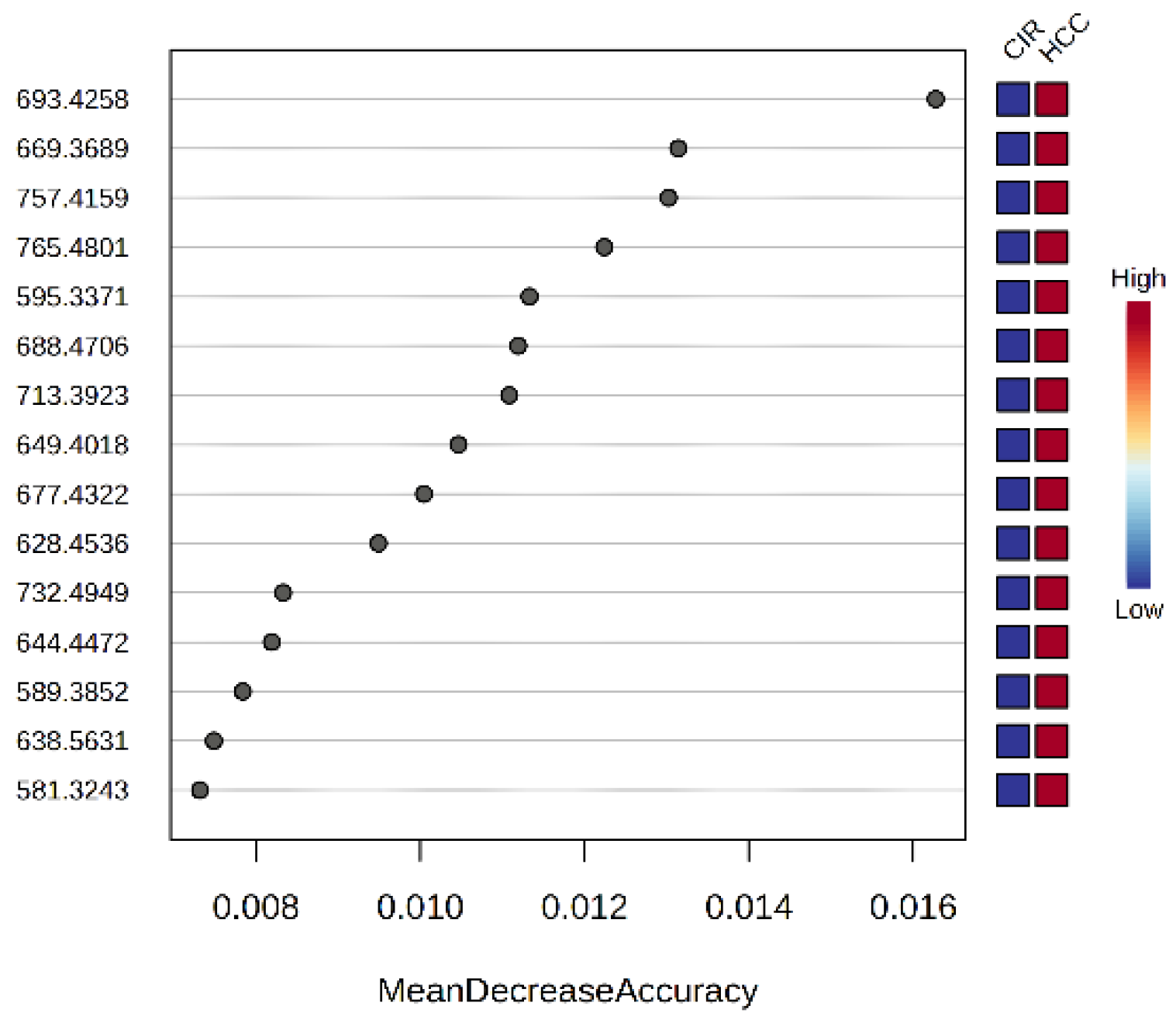 Figure 4 presents the MDA (Mean Decrease Accuracy) values for the first 15 predictive molecules, according to Random Forest analysis. A higher MDA value indicates the importance of that metabolite in the predicting group. This analysis brings complementary information about the predictive molecules to be considered as putative biomarkers of differentiation between the CIR and HCC groups.