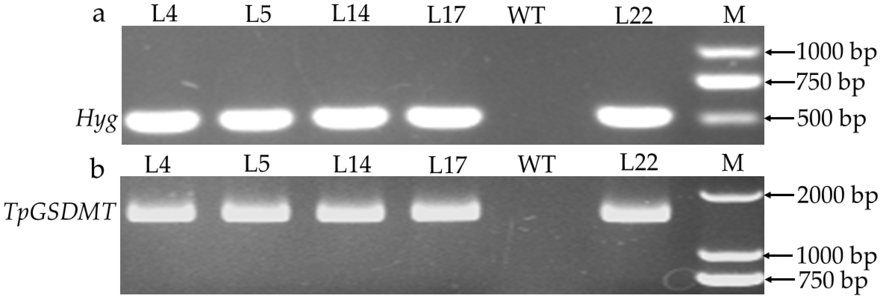 3.2. Expression Analysis of TpGSDMT in Transgenic Rice