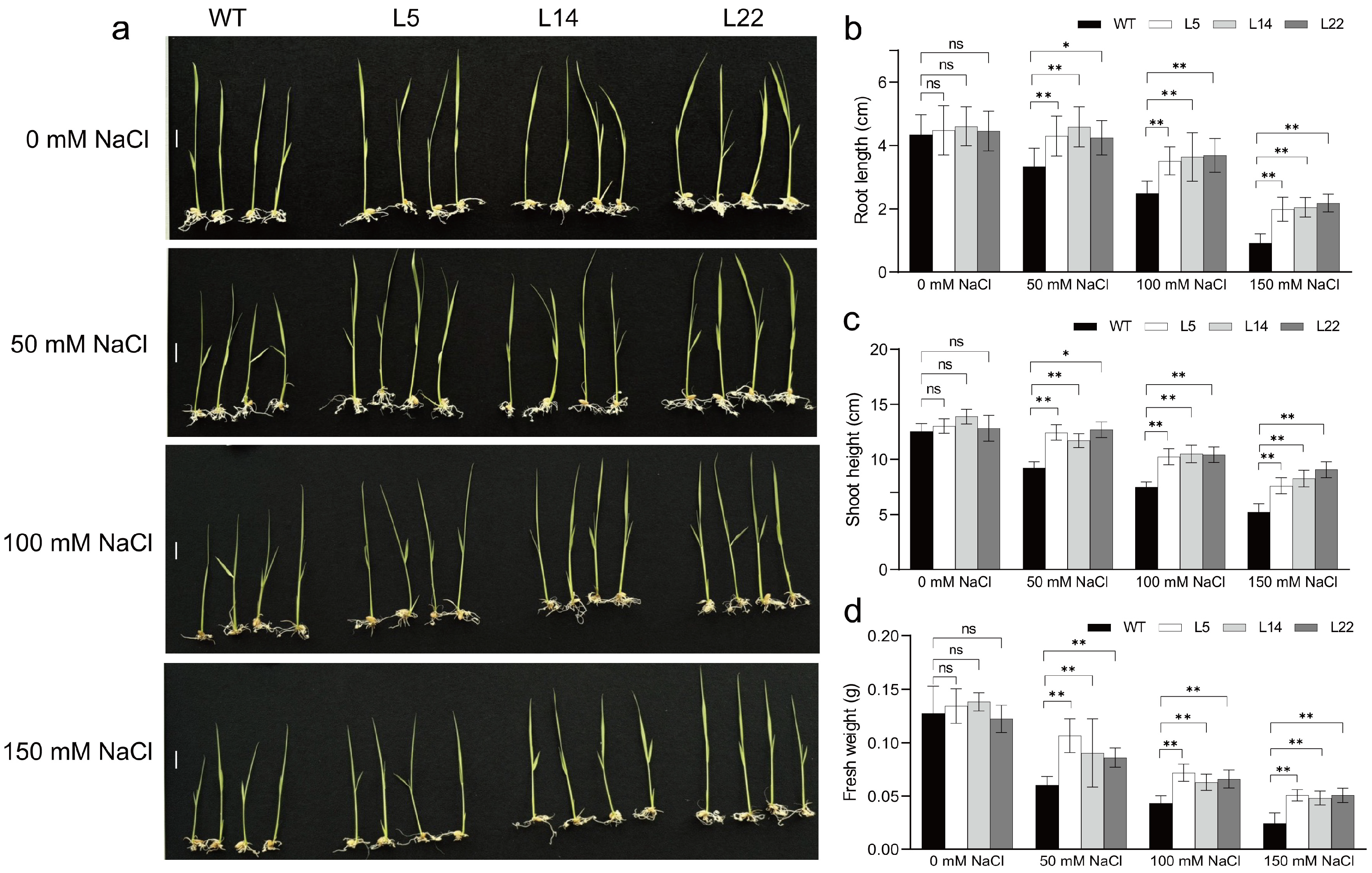2.4. Analysis of Tolerance to Salt and Low-Temperature Stresses of Transgenic Rice