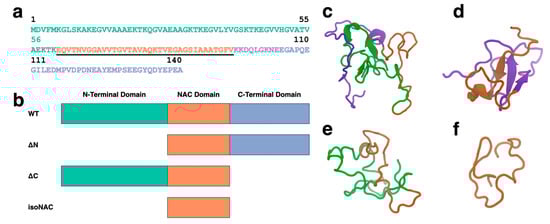 The full WT-aSyn protein has three domains: N-terminal, NAC, and C-terminal domains. The protein sequence (a) shown in this figure is colored to highlight each domain, with the N-terminal domain shown in green, the center NAC domain underlined and orange, and the C-terminal domain colored blue. Four variants were simulated for this study (b) WT, ΔN, ΔC, and isoNAC. The representative structures for the most occupied clusters of the WT (c), ΔN (d), ΔC (e), and isoNAC (f) are shown using the New Cartoon representation with the N-terminal domain in green, the NAC domain in orange, and the C-terminal domain in violet.