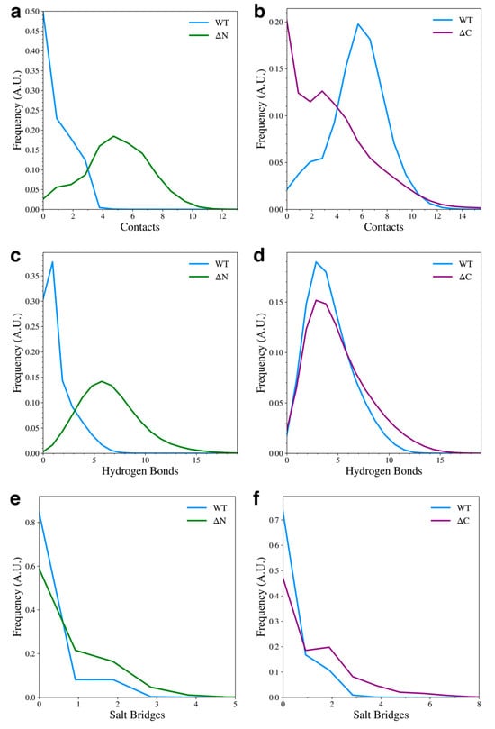 Contact distributions between the NAC and flanking domains for the WT and domain deletion variants. The plots show hydrophobic contact between NAC-C (a) and NAC-N (b), hydrogen bonds between NAC-C (c) and NAC-N (d), and salt bridges between NAC-C (e) and NAC-N (f).