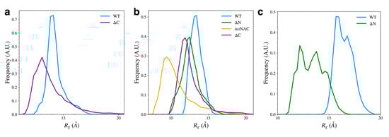 Removal of the flanking domains led to an increase in compactness of the N-terminal, NAC, and C-terminal domains (Figure 8). Removal of the C-terminal domain (Figure 8a) increased the sampling of structures with a more compact N-terminal domain. The compactness of the NAC domain also increased when both flanking domains were removed (Figure 8b). The isoNAC variant showed increased compactness compared to the WT and domain deletion variants. Removal of either the N-terminal or C-terminal domains, individually, also increased the compactness of the NAC domain when compared to the WT protein, though not as much as the isoNAC variant. The distributions of the NAC domain